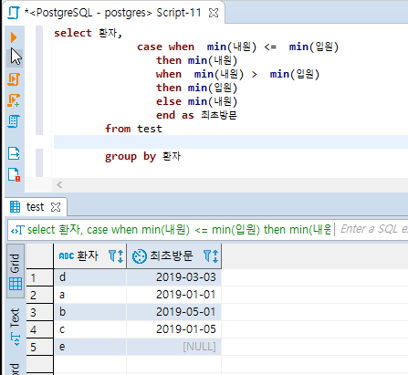 select 환자, case when min(내원) <= min(입원) then min(내원) when min(내원) > min(입원) then min(입원) else min(내원) end as 최초방문 from test group by 환자group by 환자로 묶어서 가장 작은 내원일이 가장 작은 입원일보다 작거나 같으면 입원 이전에 외래로 내원을 했던 적이 있다는 것이기 때문에 then min(내원)을 출력하도록 했고.