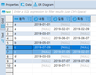 문제 해결인 듯싶지만 여기서 다시 한번 데이터를 들여다보면 c환자는 2019-07-09일에 내원한 적이 있지만,
