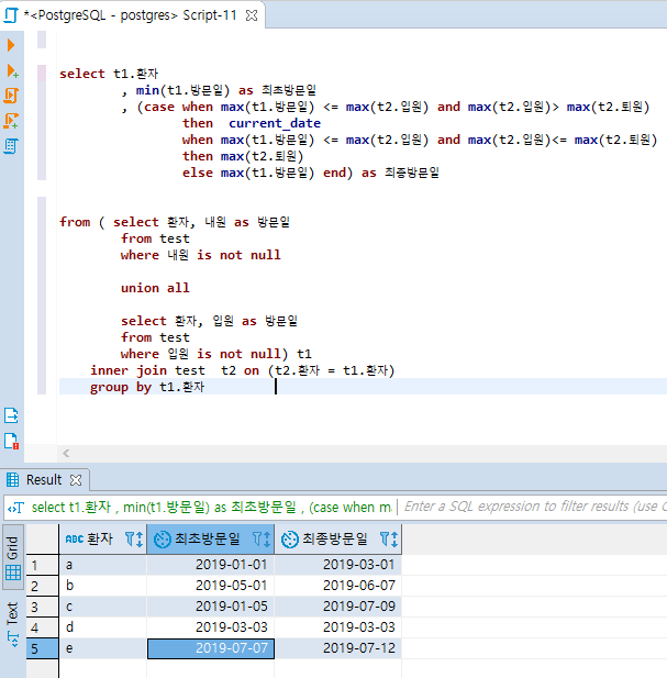 select t1.환자 , min(t1.방문일) as 최초방문일 , (case when max(t1.방문일) <= max(t2.입원) and max(t2.입원)> max(t2.퇴원) then current_date when max(t1.방문일) <= max(t2.입원) and max(t2.입원)<= max(t2.퇴원) then max(t2.퇴원) else max(t1.방문일) end) as 최종방문일 from ( select 환자, 내원 as 방문일 from test where 내원 is not null union all select 환자, 입원 as 방문일 from test where 입원 is not null) t1 inner join test t2 on (t2.환자 = t1.환자) group by t1.환자