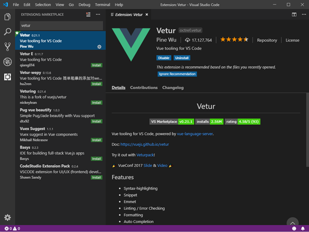 설치할 플러그인들 중 첫 번째로 Vetur라는 플러그인을 설치한다.