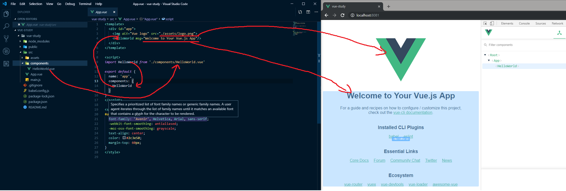 components 밑의 HelloWorld.vue 파일을 HelloWorld로 import 하여 componets에 등록하고