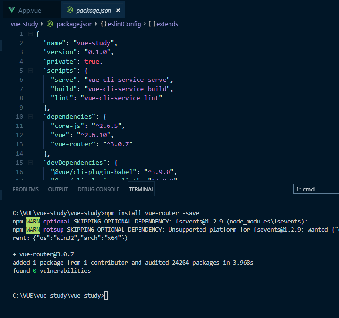 터미널에 npm install vue-router -save를 입력해 준다.