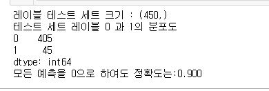 # digits번호가 7번이면 True이고 이를 astype(int)로 1로 변환, 7번이 아니면 False이고 0으로 변환. y = (digits.target == 7).astype(int) X_train, X_test, y_train, y_test = train_test_split( digits.data, y, random_state=11) # 불균형한 레이블 데이터 분포도 확인. print('레이블 테스트 세트 크기 :', y_test.shape) print('테스트 세트 레이블 0 과 1의 분포도') print(pd.Series(y_test).value_counts()) #MyFakeClassifier 학습/예측/정확도 평가 fakeclf = MyFakeClassifier() fakeclf.fit(X_train , y_train) fakepred = fakeclf.predict(X_test) print('모든 예측을 0으로 하여도 정확도는:{:.3f}'.format(accuracy_score(y_test , fakepred)))