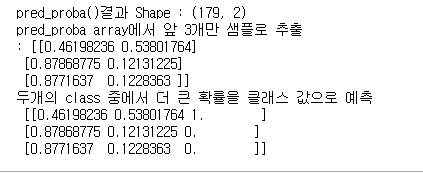 # predict_proba 분류결정 예측 확률을 반환 pred_proba = lr_clf.predict_proba(X_test) pred = lr_clf.predict(X_test) print('pred_proba()결과 Shape : {0}'.format(pred_proba.shape)) print('pred_proba array에서 앞 3개만 샘플로 추출 \n:', pred_proba[:3]) # 예측 확률 array 와 예측 결과값 array 를 concatenate 하여 예측 확률과 결과값을 한눈에 확인 pred_proba_result = np.concatenate([pred_proba , pred.reshape(-1,1)],axis=1) print('두개의 class 중에서 더 큰 확률을 클래스 값으로 예측 \n',pred_proba_result[:3])