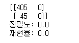예측모델에서 Positive로 예측을 단 한 번도 하지 않았기 때문에 정밀도와 재현율이 모두 0이다.