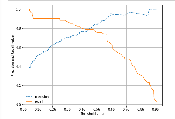 import matplotlib.pyplot as plt import matplotlib.ticker as ticker def precision_recall_curve_plot(y_test , pred_proba_c1): # threshold ndarray와 이 threshold에 따른 정밀도, 재현율 ndarray 추출. precisions, recalls, thresholds = precision_recall_curve( y_test, pred_proba_c1) # X축을 threshold값으로, Y축은 정밀도, 재현율 값으로 각각 Plot 수행. 정밀도는 점선으로 표시 plt.figure(figsize=(8,6)) threshold_boundary = thresholds.shape[0] plt.plot(thresholds, precisions[0:threshold_boundary], linestyle='--', label='precision') plt.plot(thresholds, recalls[0:threshold_boundary],label='recall') # threshold 값 X 축의 Scale을 0.1 단위로 변경 start, end = plt.xlim() plt.xticks(np.round(np.arange(start, end, 0.1),2)) # x축, y축 label과 legend, 그리고 grid 설정 plt.xlabel('Threshold value'); plt.ylabel('Precision and Recall value') plt.legend(); plt.grid() plt.show() precision_recall_curve_plot( y_test, lr_clf.predict_proba(X_test)[:, 1] )