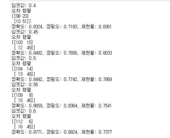 # 테스트를 수행할 모든 임곗값을 리스트 객체로 저장. thresholds = [0.4, 0.45, 0.50, 0.55, 0.60] def get_eval_by_threshold(y_test , pred_proba_c1, thresholds): # thresholds list객체내의 값을 차례로 iteration하면서 Evaluation 수행. for custom_threshold in thresholds: binarizer = Binarizer(threshold=custom_threshold).fit(pred_proba_c1) custom_predict = binarizer.transform(pred_proba_c1) print('임곗값:',custom_threshold) get_clf_eval(y_test , custom_predict) get_eval_by_threshold(y_test ,pred_proba[:,1].reshape(-1,1), thresholds )