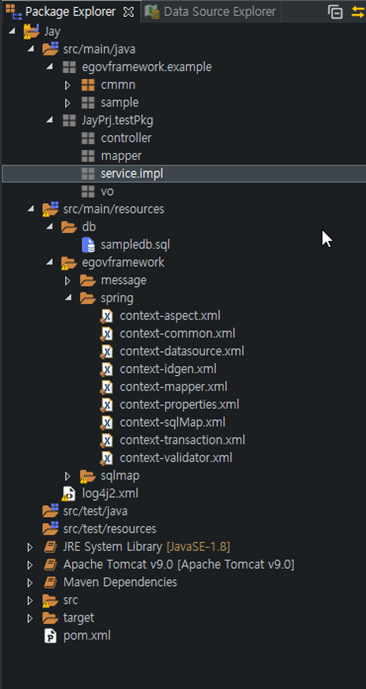 src->main->resources->egovframework->spring 밑의 context-common.xml의base-package를 eGovframework에서 JayPrj로 변경해준다.