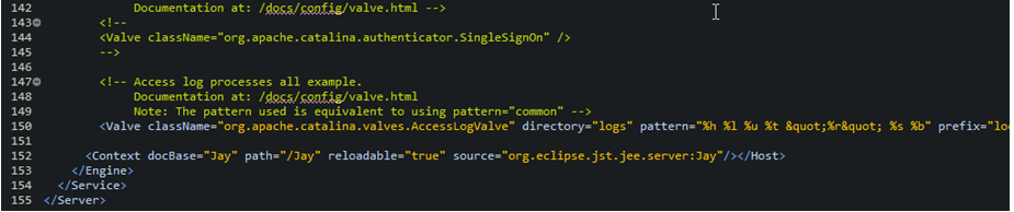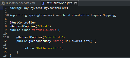 package JayPrj.testPkg.controller; import org.springframework.web.bind.annotation.RequestMapping; import org.springframework.web.bind.annotation.ResponseBody; import org.springframework.web.bind.annotation.RestController; @RestController @RequestMapping("/test") public class testHelloWorld { @RequestMapping("/hello.do") public @ResponseBody String HelloWorldTest() { return "Hello World!!"; } }아참 server.xml의 가장 아래쪽의 context docbase, path도 확인해준다.