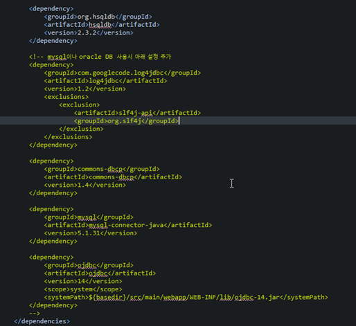 <!-- 아래의 메모리DB dependency는 삭제 --> <dependency> <groupId>org.hsqldb</groupId> <artifactId>hsqldb</artifactId> <version>2.3.2</version> </dependency> <!-- 사진에서 주석으로 막혀있던 dependency중 아래 2개는 삭제 --> <dependency> <groupId>ojdbc</groupId> <artifactId>ojdbc</artifactId> <version>14</version> <scope>system</scope> <systemPath>${basedir}/src/main/webapp/WEB-INF/lib/ojdbc-14.jar</systemPath> </dependency> <dependency> <groupId>commons-dbcp</groupId> <artifactId>commons-dbcp</artifactId> <version>1.4</version> </dependency> <!-- 주석으로 막혀있던 dependency중 아래 2개는 유지 --> <dependency> <groupId>com.googlecode.log4jdbc</groupId> <artifactId>log4jdbc</artifactId> <version>1.2</version> <exclusions> <exclusion> <artifactId>slf4j-api</artifactId> <groupId>org.slf4j</groupId> </exclusion> </exclusions> </dependency> <dependency> <groupId>mysql</groupId> <artifactId>mysql-connector-java</artifactId> <version>5.1.31</version> </dependency> <!-- MariaDB 연동을 위해 아래 dependency 추가 --> <dependency> <groupId>org.mariadb.jdbc</groupId> <artifactId>mariadb-java-client</artifactId> <version>2.4.1</version> </dependency>context-datasource의 설정도 수정해야한다.