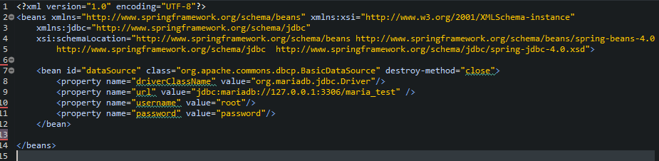 <bean id="dataSource" class="org.apache.commons.dbcp.BasicDataSource" destroy-method="close"> <property name="driverClassName" value="org.mariadb.jdbc.Driver"/> <property name="url" value="jdbc:mariadb://127.0.0.1:3306/maria_test" /> <property name="username" value="root"/> <property name="password" value="password"/> </bean>여기서 url username password를 각자 DB의 설정을 넣어준다.