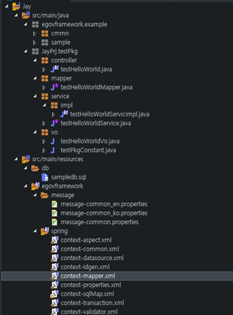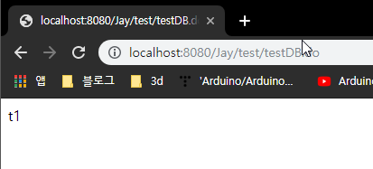 @Mapper("testHelloWorldMapper") public interface testHelloWorldMapper { List<testHelloWorldVo> testDB() throws Exception; }<?xml version="1.0" encoding="UTF-8"?> <!DOCTYPE mapper PUBLIC "-//mybatis.org//DTD Mapper 3.0//EN" "http://mybatis.org/dtd/mybatis-3-mapper.dtd"> <mapper namespace="JayPrj.testPkg.mapper.testHelloWorldMapper"> <select id="testDB" resultType="JayPrj.testPkg.vo.testHelloWorldVo"> SELECT * FROM sample </select> </mapper>모든 코딩이 끝났다.