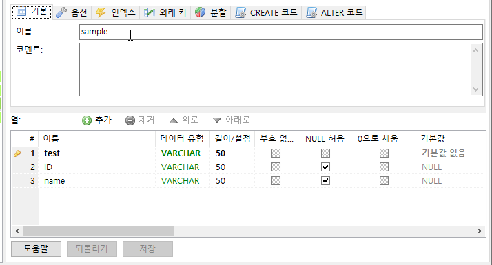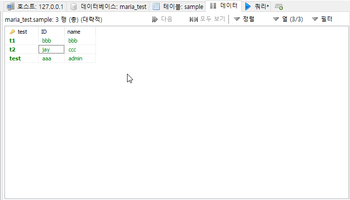 DB에도 마찬가지로 위의 3개의 column test, ID, name을 생성하여 적당히 값을 넣어준다.