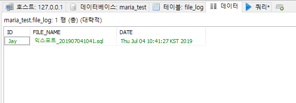 <insert id="fileUploadLog" parameterType="JayPrj.testPkg.vo.testFileUploadVo"> INSERT INTO FILE_LOG ( ID ,FILE_NAME ,DATE )VALUES ( '${id}' ,'${fileName}' ,'${date}' ) </insert>업로드한 사람의 ID와 파일명 날짜 데이터를 받아 DB에 기록한다.